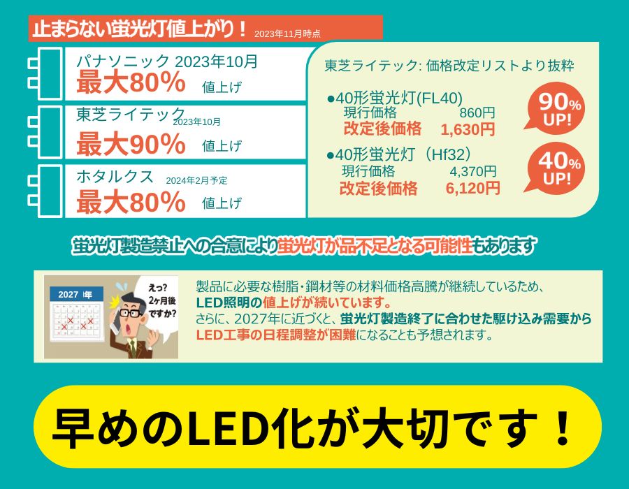 2027年が近づくにつれ、蛍光灯の在庫確保を急ぐ動きが増え、価格の上昇や品不足が懸念されています。特に業務用の蛍光灯を多く使用している企業では、早期に対応することで、これらのリスクを回避できます。 - 原材料の高騰によるLED照明の値上がり
