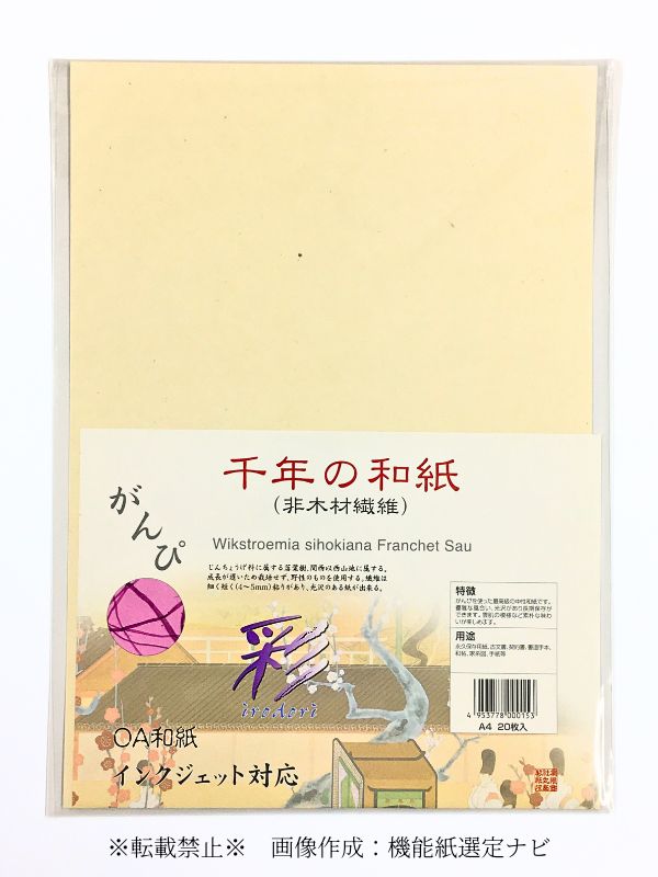 千年の和紙は、名前が示す通り1000年残すことを目指して開発された和紙シリーズです。特徴は原料に木材パルプを使わず、非木材由来の繊維だけで作られている点です。それぞれ異なる植物繊維を活かした6種類のラインナップがあります。中性抄紙技術により酸を含まないため、経年劣化や変色に極めて強い紙に仕上がっています。「千年の和紙」はインクジェットプリンタ・レーザープリンター対応のOA和紙でもあり、現代の印刷機で扱いやすいよう紙厚や寸法も整えられています。
