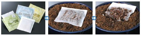 水溶紙にはヒートシール性があるので、袋状に加工でき、種を包んだまま土に置くだけで使用できます。土中の水分で紙が溶けるため発芽を妨げず、細かな種でも扱いやすくなるほか、使用後も土に余計なものを残さない環境にやさしい点が特長です。