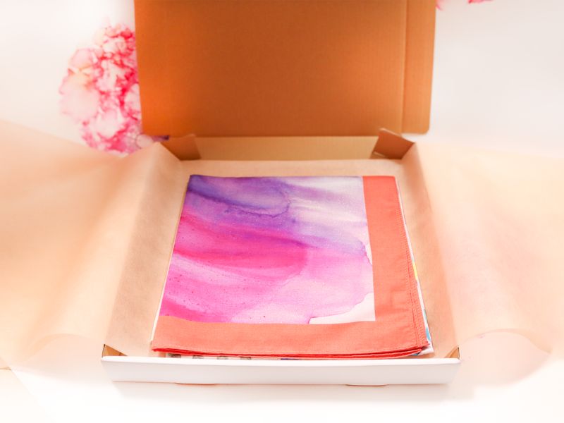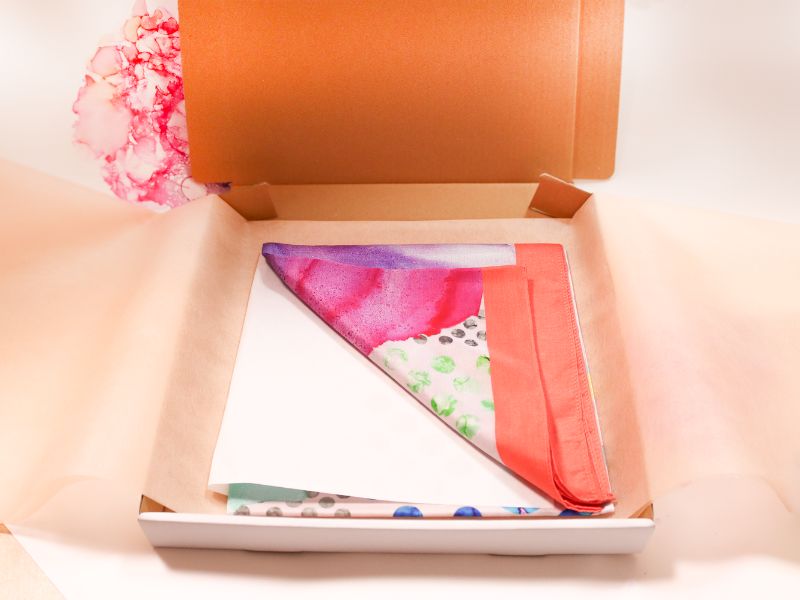 シルクシフォンのスカーフ配送時に発生していた 『折り畳み形状の崩れ』や 『くしゃっと歪んで届いてしまう』といった課題を解決するため、防滑紙(ぴたっとシート)を採用いただきました。