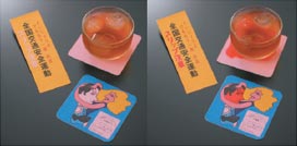飲み物を入れたグラスを置くと、水滴がしみて色が変わる仕掛け。
